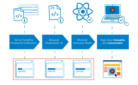 서버를 이용해서 페이지를 구성하기 때문에 클라이언트에서 구성하는 CSR보다 페이지를 구성하는 속도는 늦지만 사용자에게 보여주는 콘텐츠 구성이 완료되는 시점은 빨라짐